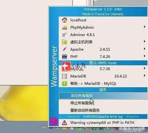 请注意:若系统提示无法访问,建议您重启相关服务。您可以通过在右下角找到Wampmanager图标,右键单击并选择“启动所有服务”,如图所示。
