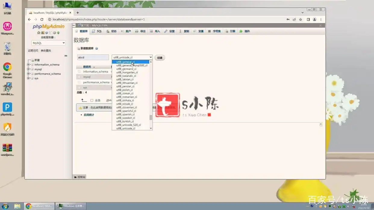 在左侧菜单中点击“新建”,输入数据库名称abcd,选择字符编码为“utf8_general_ci”,然后点击“创建”按钮。创建完成后,左侧将显示名为abcd的数据库。