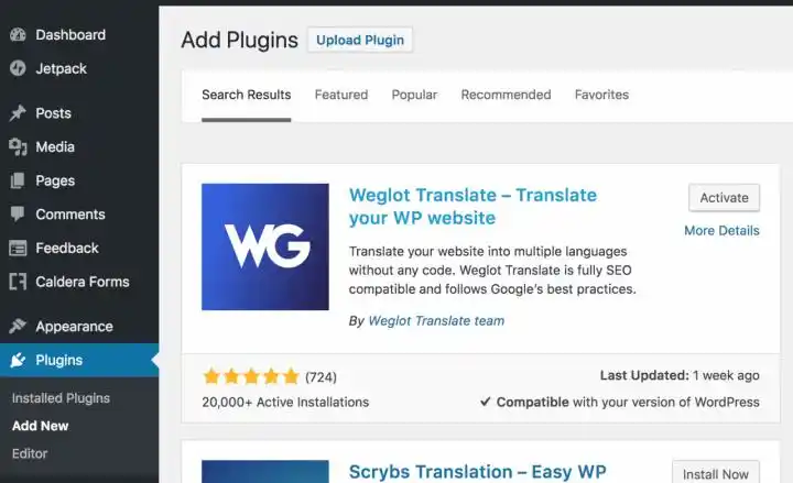 此外,Weglot还提供免费的版本,您可以通过WordPress插件库进行获取:在WordPress仪表板中,依次点击插件→安装插件,搜索Weglot并安装后激活。