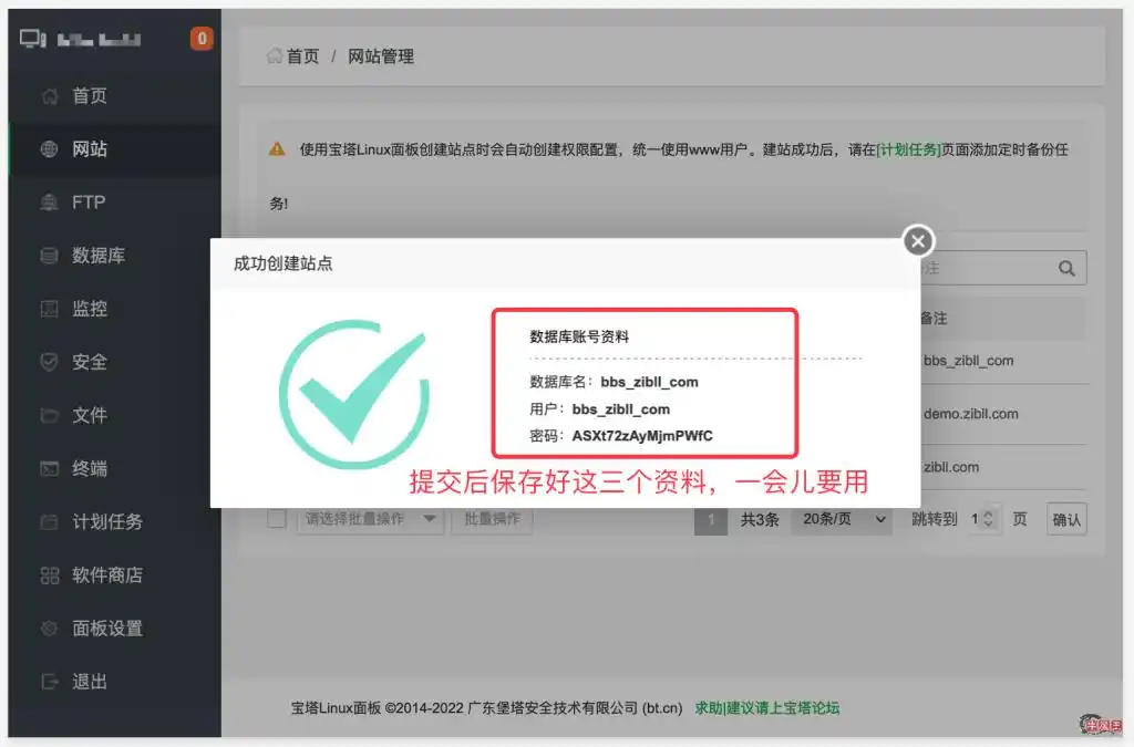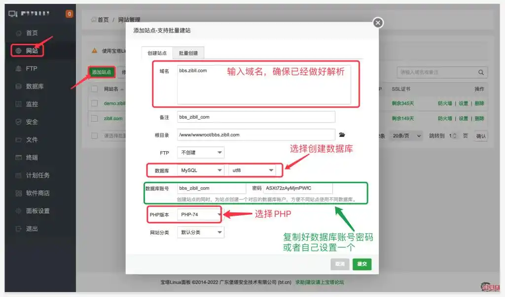 进入网站管理界面,点击“创建网站”,输入域名,选择创建数据库,并设置PHP版本,最后提交。
