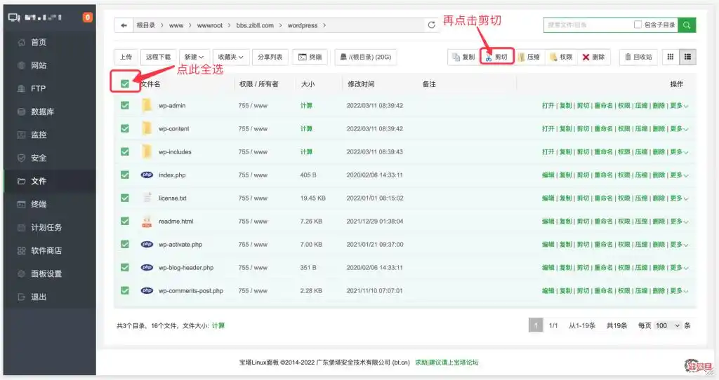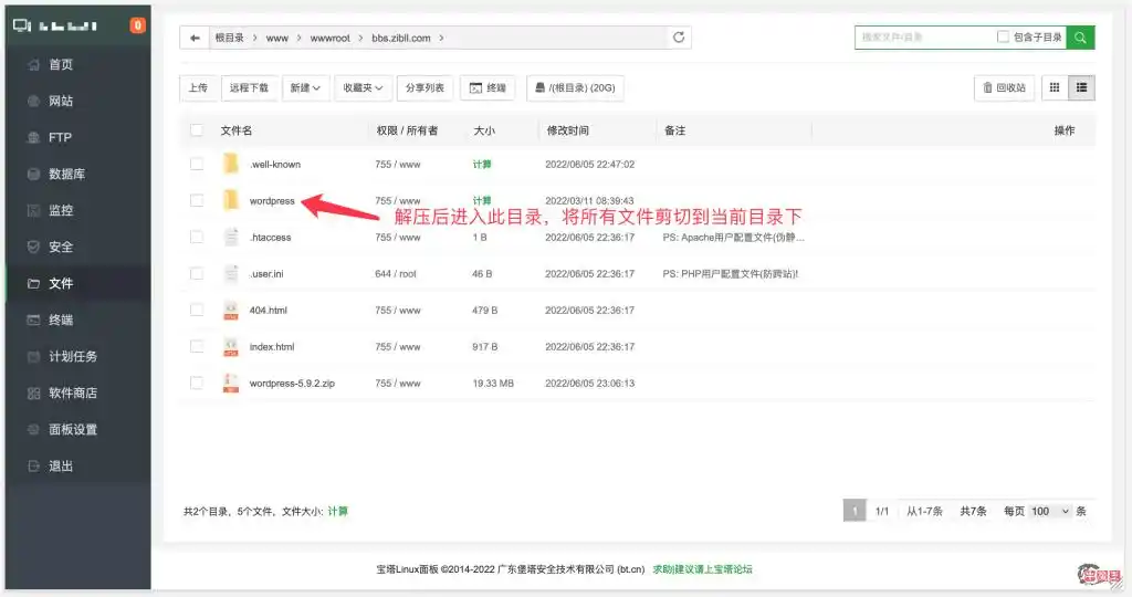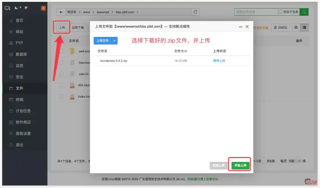 进入网站目录,上传之前下载的WordPress.zip压缩包,并进行解压缩。