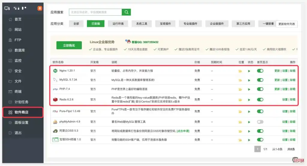 首先,登录宝塔后台,进入软件商店,搜索并安装以下软件(备注:如果已安装可以跳过此步骤)。