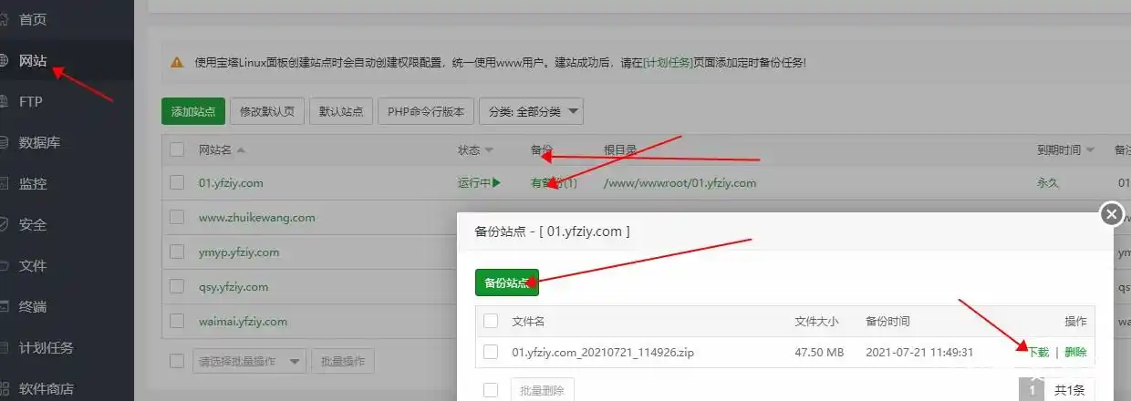 在宝塔面板上操作时,方法类似:点击“网站”并选择相应的网站备份,之后点击“备份”按钮,网站内容便会完成备份,最后只需点击“下载”即可。
