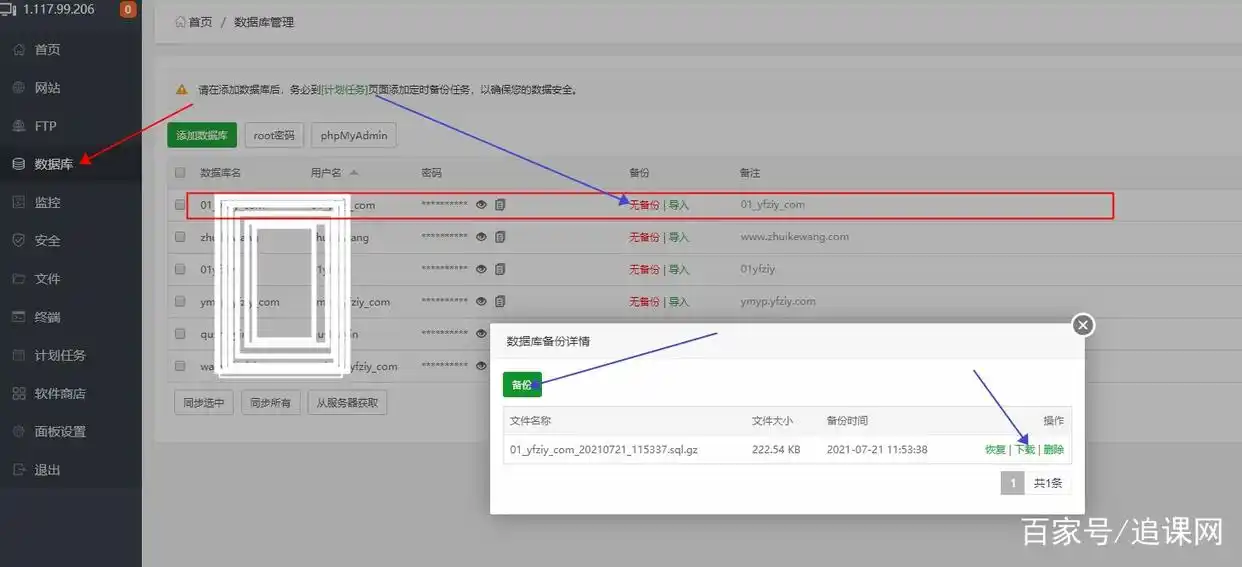 除了网站文件,数据库的备份同样重要。我们需要在左侧选择“数据库”,找到对应的网站数据库,点击“备份”后即可下载。此时,网站的文件和数据库都已完整打包。
