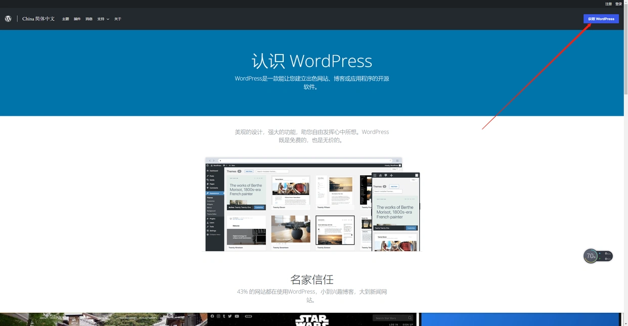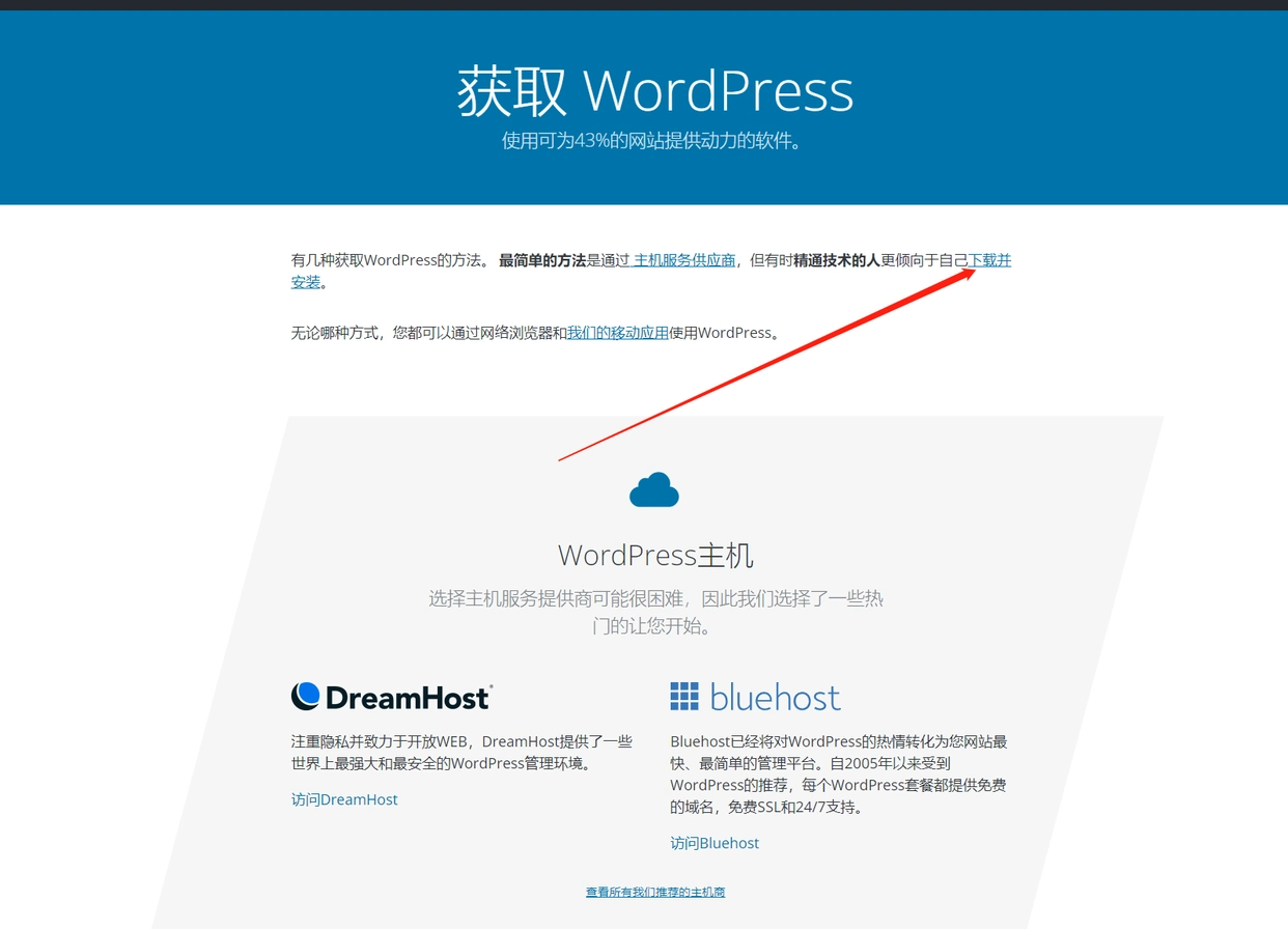 请自行搜索WordPress官方网站。打开后,点击右上角的“获取WordPress”按钮,进入下载页面,接着点击页面中央的“下载并安装”链接进行下载。下载完成后,将WordPress压缩文件复制到PHP运行目录中,该目录位于您在第一步安装phpEvn时所指定的www文件夹内。