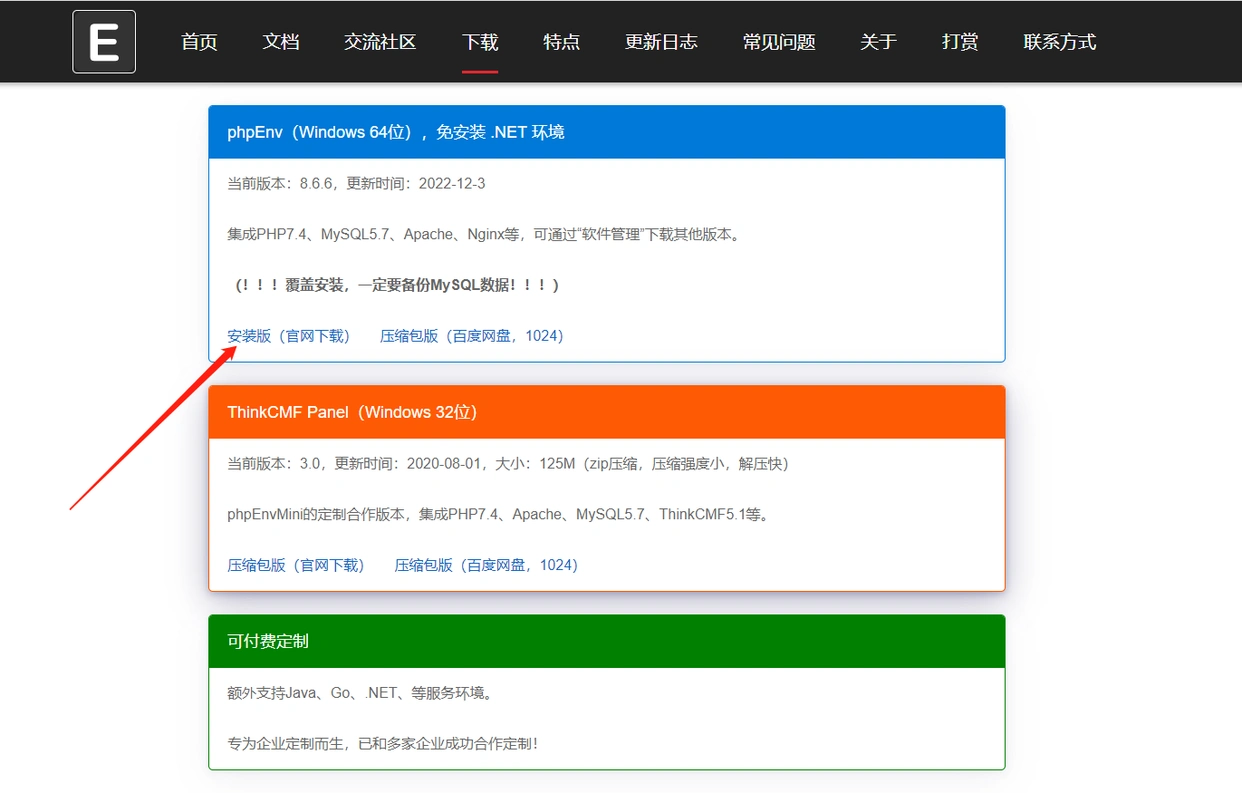 选择“安装版(官网下载)”以开始下载phpEvn。
