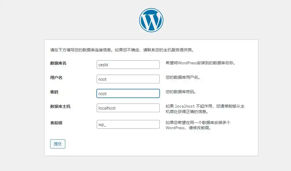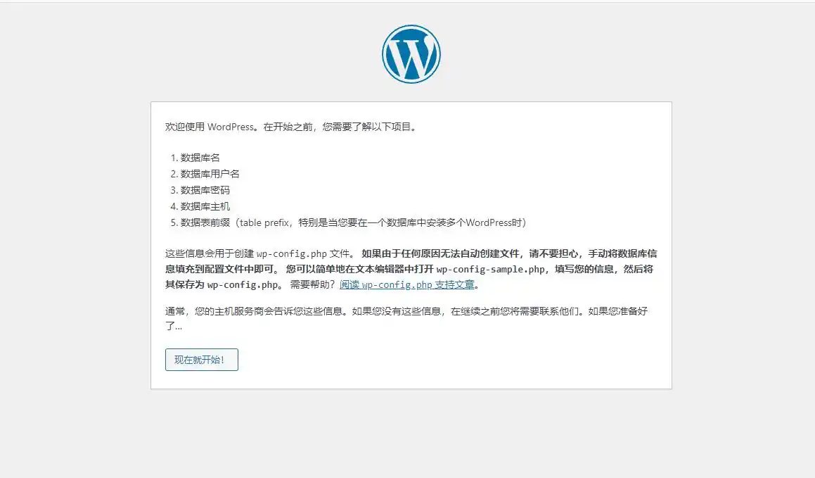 这里仅为示例,实际数据库名可自行决定。在数据库创建完成后,点击“现在就开始!”开始WordPress的安装。