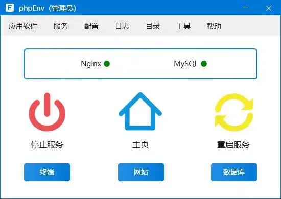 安装完成后,启动phpEvn。点击“启动服务”按钮,当nginx和Mysql的指示灯由红色变为绿色时,表示服务启动成功。Mysql的默认主机地址是localhost,用户名和密码均为root。
