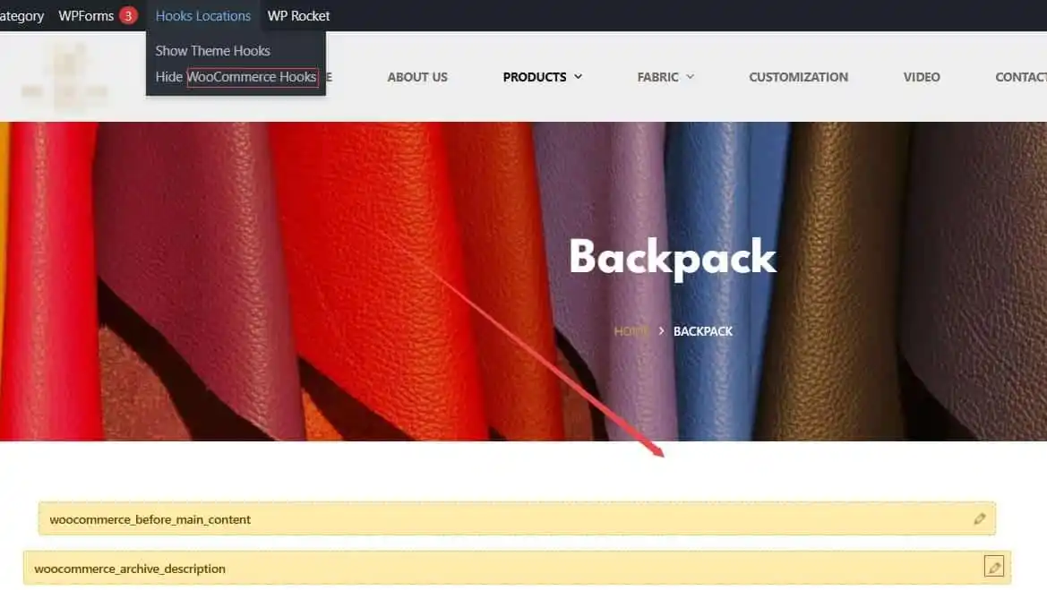 如图所示,找到HOOKS选项,然后点击【woocommerce_archive_description】旁边的铅笔图标。