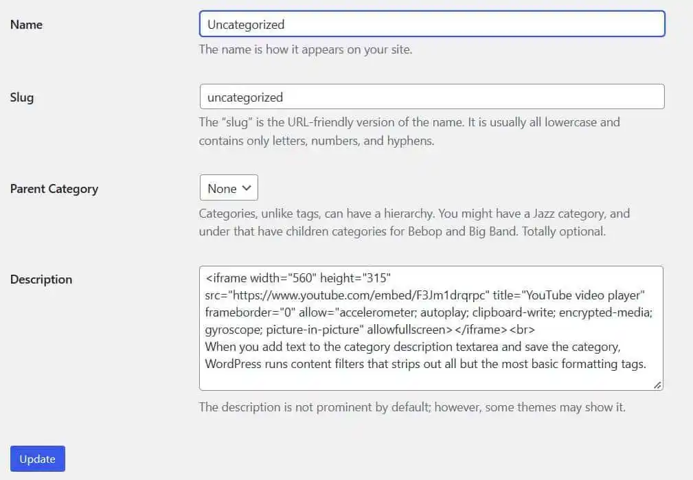 编辑分类后,在描述部分输入一段YouTube视频的HTML代码及相关文字介绍,然后进行更新。