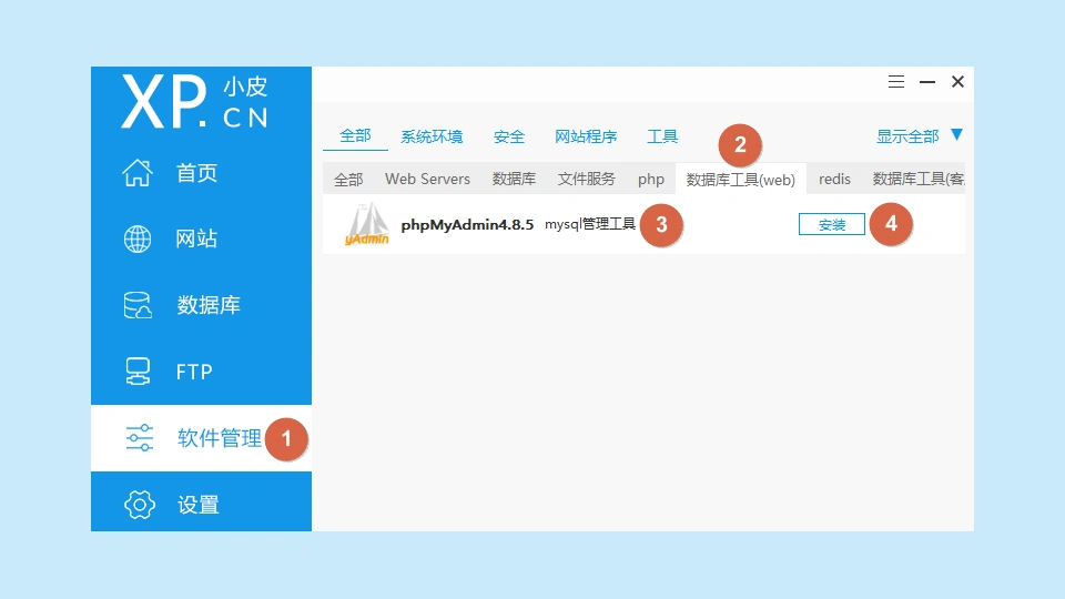PhpStudy V8.1默认并不包含phpMyAdmin。为了方便后续数据库的创建与管理,我们需要安装phpMyAdmin。依次找到【软件管理】->【数据库工具(web)】->【phpMyAdmin4.8.5】,然后点击【安装】。