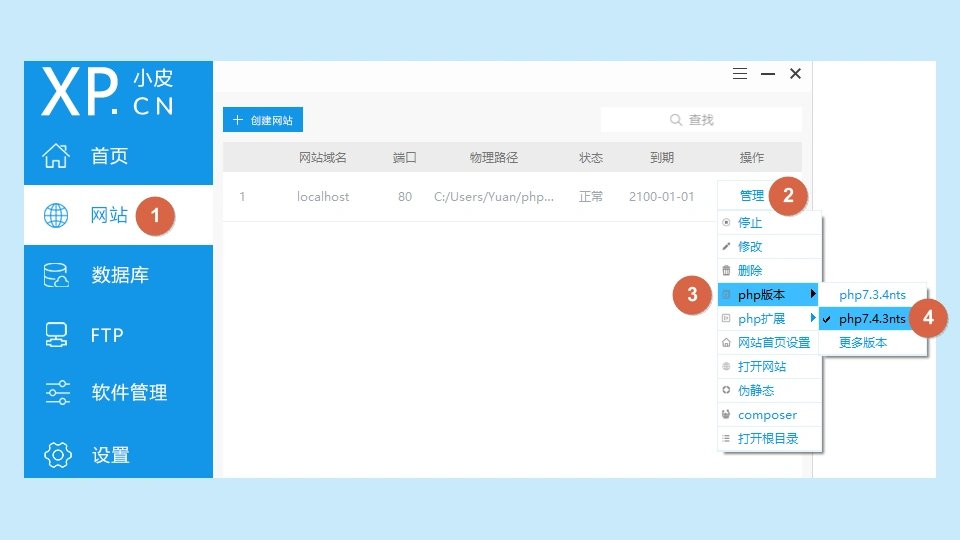 在PhpStudy中,依次找到【网站】->【管理】->【PHP版本】,然后选择【php7.4.3nts】。如果没有对应的版本,可以在【软件管理】的【PHP】选项中进行安装。