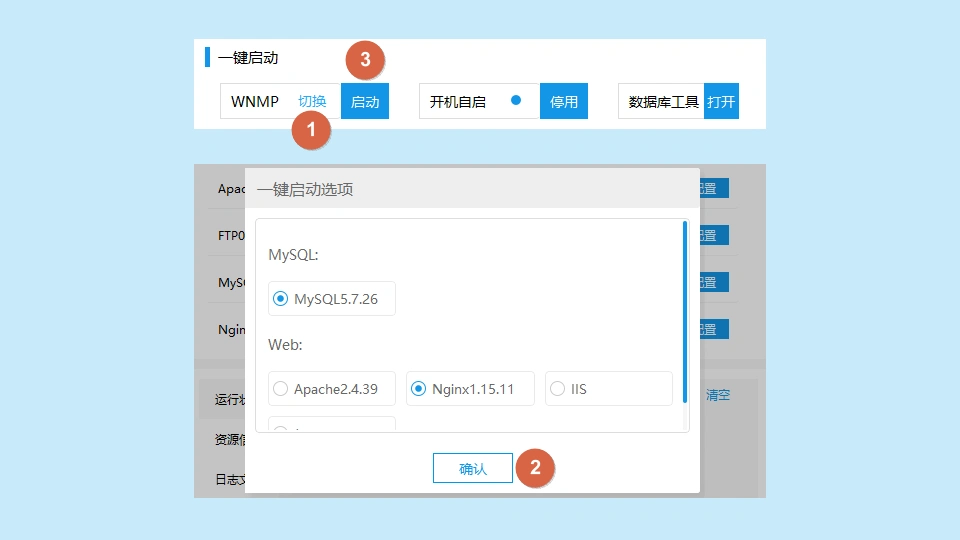 在PhpStudy中,依次点击【首页】->【一键启动】->【WNMP】->【切换】,选择合适的版本后点击【确定】,接着在【一键启动】中选择【启动】。
