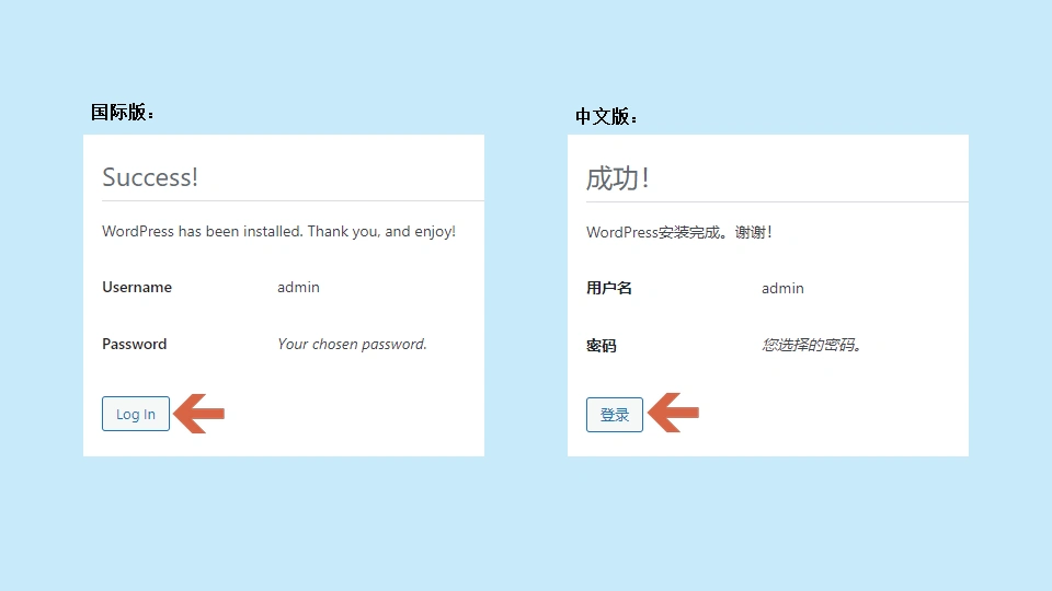 要登录后台,可以点击上图的【登录】按钮,或者在浏览器地址栏中输入【网站地址/wp-admin】。例如,在此情况下,我输入的是【localhost/wpen/wp-admin】(或【localhost/wpcn/wp-admin】),即可跳转到登录页面。接着,输入【用户名】和【密码】后点击【登录】即可。