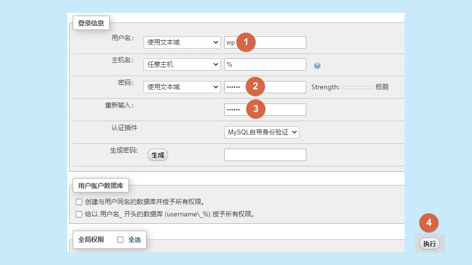 在打开的页面中,所有设置保持默认状态,只需在【用户名】、【密码】和【重新输入】中填写你希望创建的账户信息,这里我设定的用户名是【wp】,密码为【123456】,然后点击【执行】。务必确保其他设置与下图保持一致。