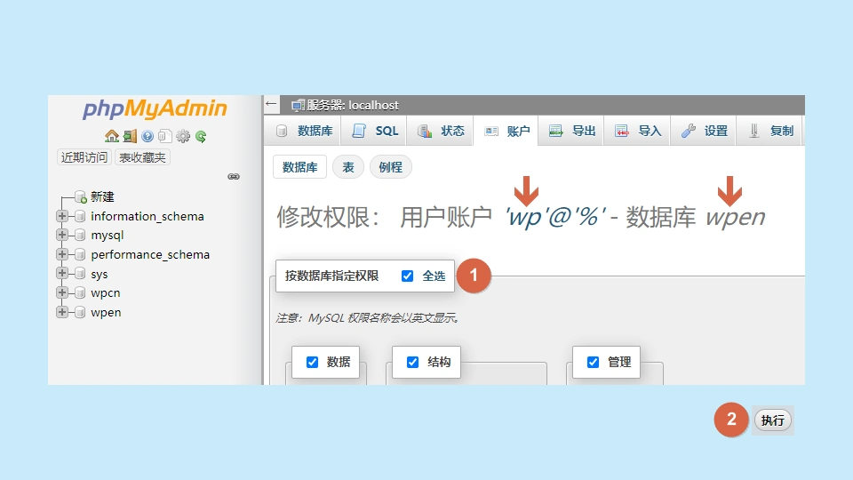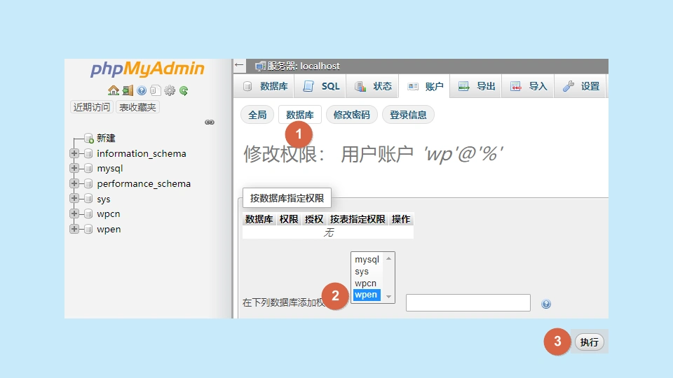 在新的页面中,不必更改任何设置,只需点击【数据库】选项,接着选中刚才创建的数据库【wpen】,最后点击【执行】以完成权限的设置。