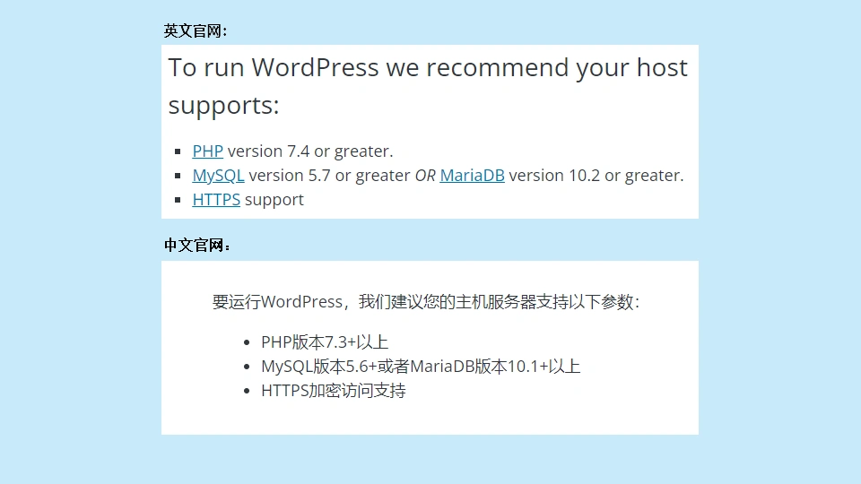 在安装任何软件之前,了解所需的最佳环境是至关重要的,这样可以确保软件能够以最佳状态运行。根据官方网站的信息,WordPress 5.9.1建议使用PHP 7.4或更高版本,MySQL 5.7(或MariaDB 10.2)及更高版本,以及Apache、Nginx或其他Web服务器。特别是在生产环境中,HTTPS几乎是必不可少的功能。需要注意的是,最好参考英文官网,因为中文官网的更新有时会滞后。