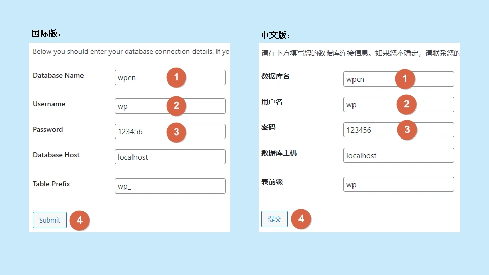 在接下来弹出的页面中,依次输入第二部分创建的【数据库名】、【用户名】和【密码】,然后点击【提交】按钮。