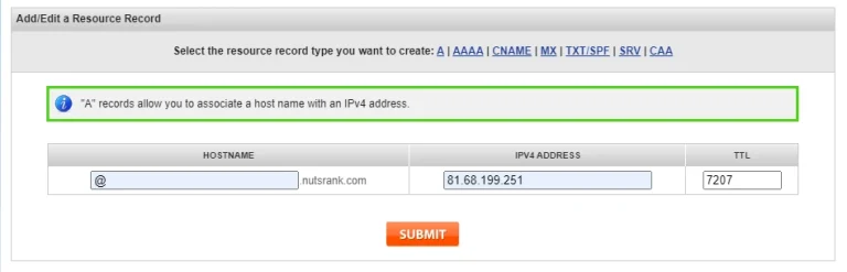 在NameSilo中添加一条指向主域名的A记录解析