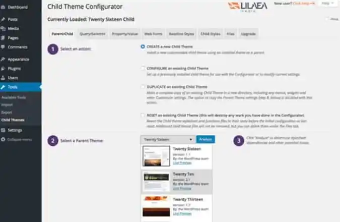 启用Child Theme Configurator插件后,您只需选择默认设置中的父主题,便可轻松生成子主题。当然,您也可以根据自己的需求进一步自定义子主题。生成完成后,请务必到外观-主题中手动启用它。