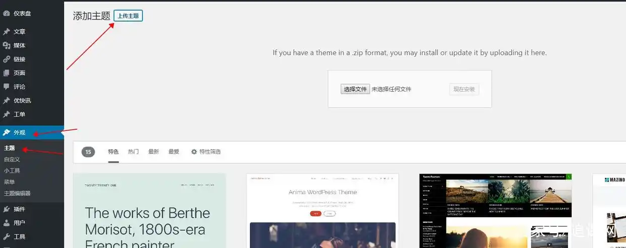 首先,我们需要确保WordPress程序已经正确安装(如果不熟悉,可以参考我之前的文章)。接下来,登录到网站后台(一般是:域名/wp-admin),依次点击“外观”→“主题”,然后在左上角找到并点击“添加”按钮,接着选择“上传主题”,选择主题包进行上传。之后,返回到后台的“外观”选项,找到Ripro主题并启用。