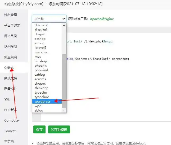 刷新首页后,您是否能够顺利访问网站呢?关于这个主题,还有几个设置是必须进行的。首先,需要设置伪静态,选择WordPress进行保存即可。
