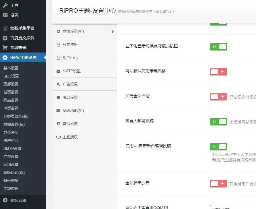 关于主题的进一步调整,可以在左侧底部找到“RiPro主题设置”。在这里,我们可以查看重要的设置信息,下面我将介绍几个关键的设置。