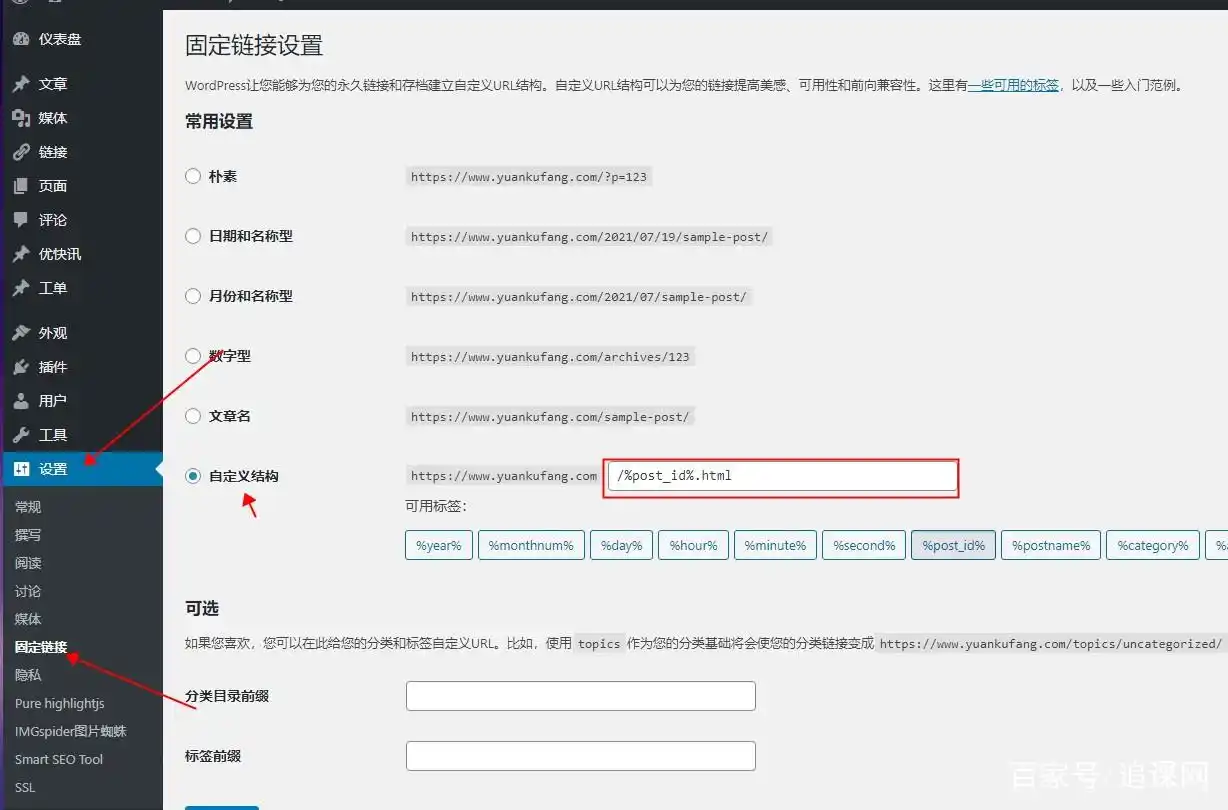 另一个重要的设置是固定链接。如果不进行此步骤,网站的许多页面将无法访问。请在“设置”→“固定链接”中选择“自定义链接”,输入/%post_id%.html并保存。