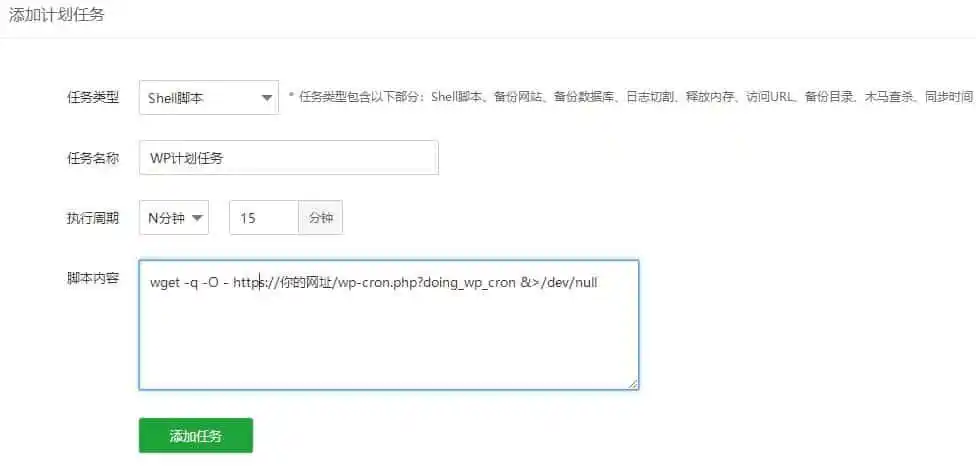*/15 * * * * wget -q -O - https://你的网址/wp-cron.php?doing_wp_cron &>/dev/null